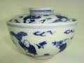 【詳細】明治後期 染付唐子図飯碗です。4人の唐子が蓋・本体共に木馬等で遊んでいる姿が描かれています。