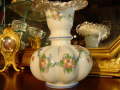【詳細】アメリカ Fenton社 ミルクガラスが可愛い、シルバークレストのフラワーベースです。薔薇(バラ)が手描きで、とても存在感もあります。お色の組み合わせが珍しいかと思います。