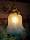 【詳細】アメリカ アンティーク ブルーのサテンガラス フリル ランプシェードです。すっきりしたお色のブルーにあかりを灯すと、たちまち温かみのある空間がひろがります。
