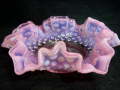 【詳細】アメリカ ヴィンテージ フェントン社 ホブネイル クランベリーオパールセント フリル ボンボンディッシュです。人気のお色が1点のみ入荷致しましたです♪クランベリーというよりは、濃いめのピンクといったお色で、乳白の部分が、イチゴミルクの様な色合いになり、とっても可愛いです♪小ぶりな割りにはダイナミックなフリルです☆